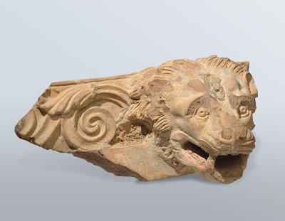 | Rzygacz w formie lwiej głowy z fragmentem przyległej simy, Ateny/Attyka, kon. IV – pocz. III w. p.n.e., terakota ze zbiorów Uniwersytetu Wrocławskiego |